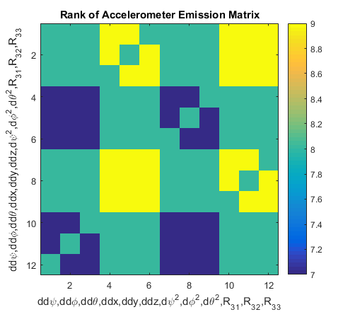 Thus, there are only 9 of those values that can be determined from accelerometers alone. To find which states are linked, we can systematically remove columns from the matrix and re-test its rank. If the rank diminishes, then that column was an independent vector and corresponds to a state not ineffably tied to the value of any other state.